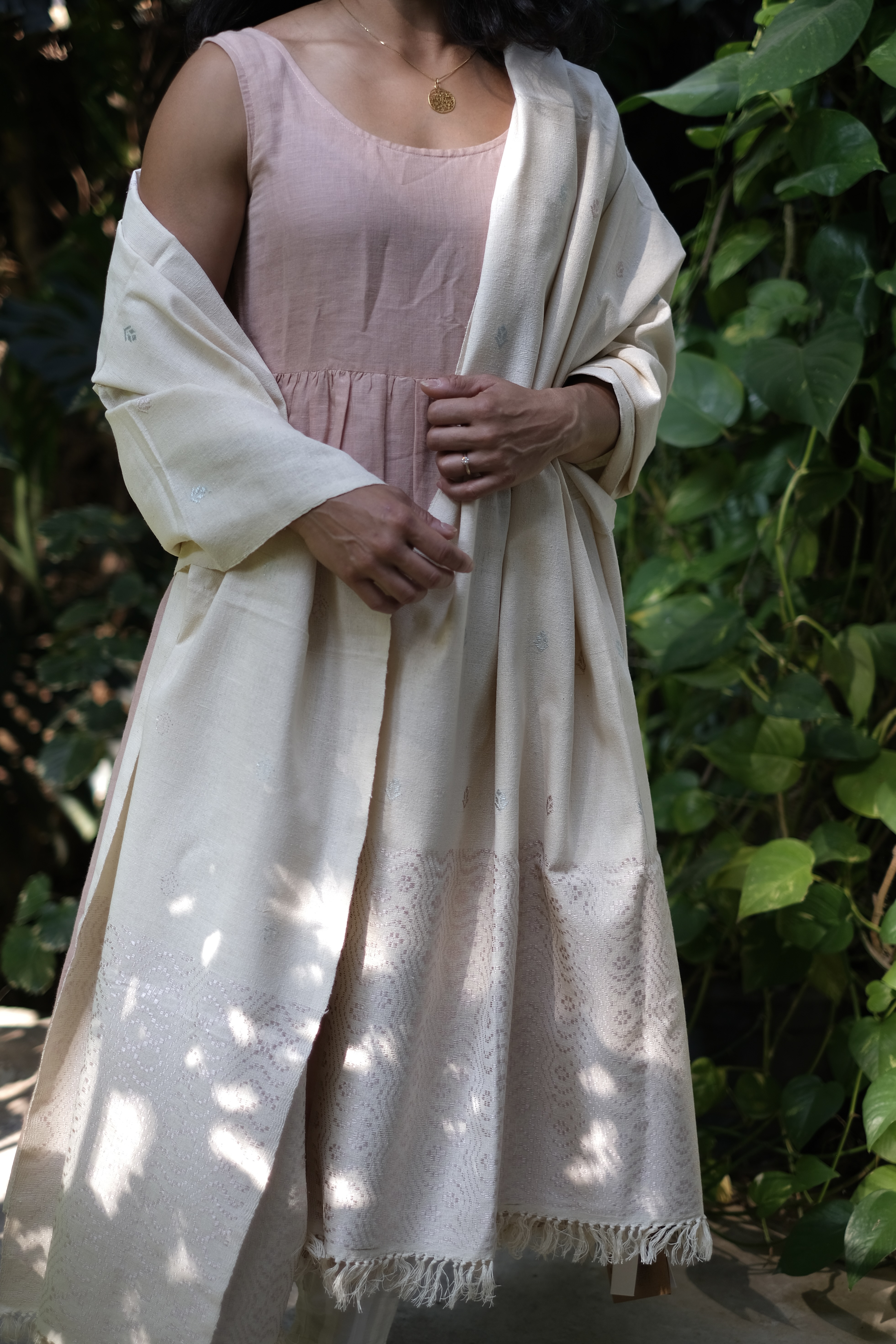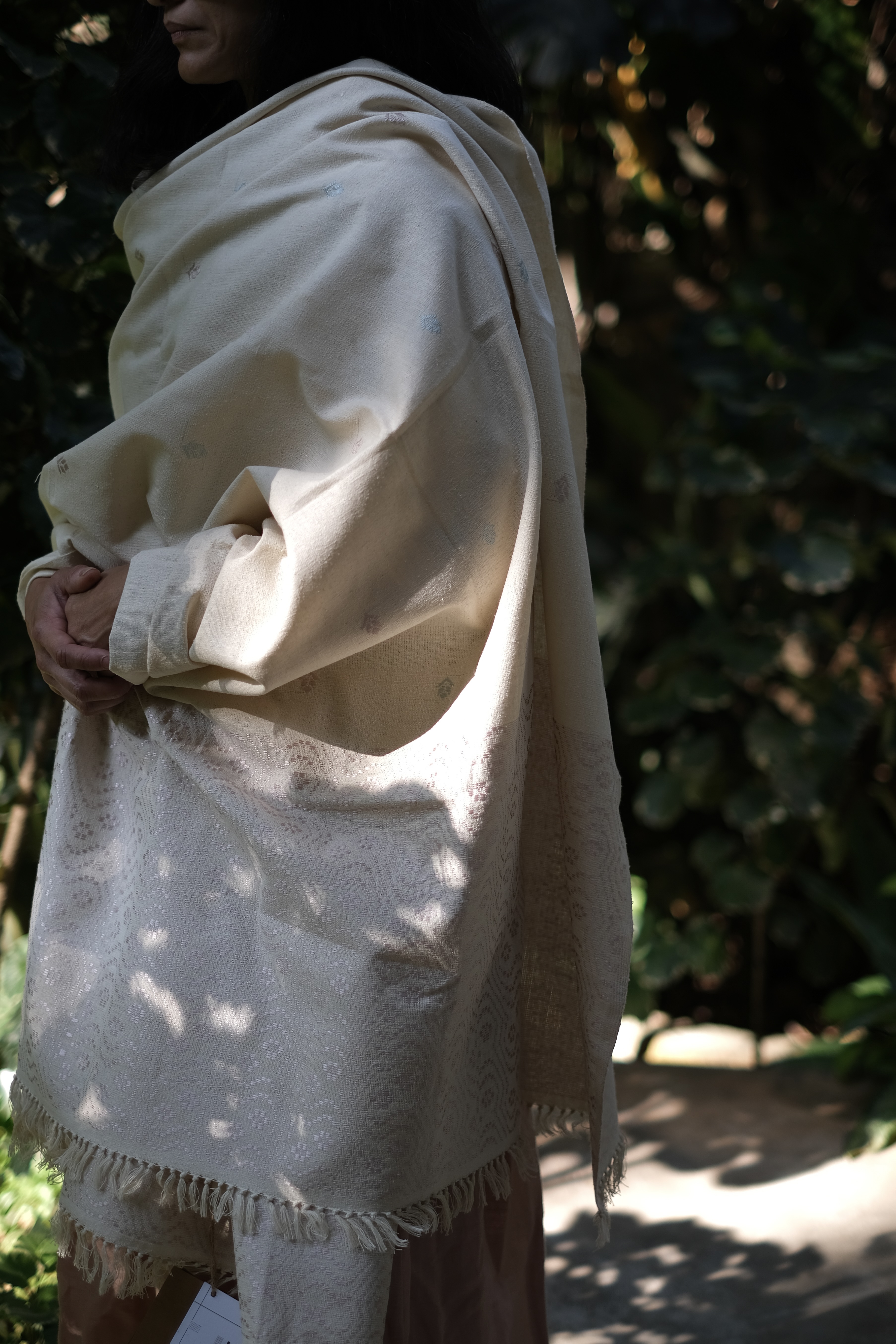 Intricate floral buta in mulberry silk on a fine eri ground. Both faces of the fabric perfectly finished, a testament to the skill of the weaver. The two ends of the dupatta have a dense motif with spaced out floral buti across the body.