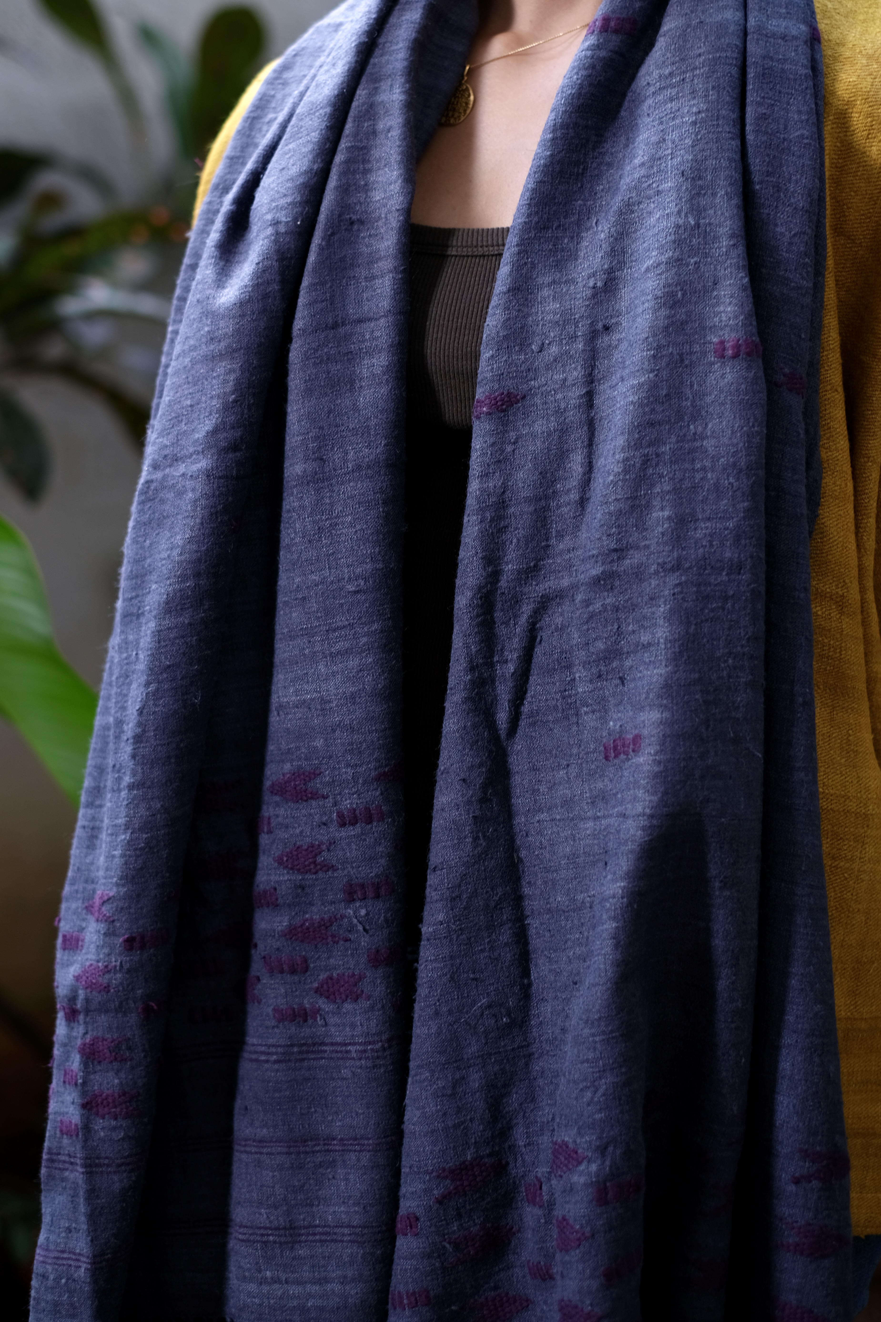 Vegetable dyed handspun, handwoven eri stole in a shade of dark grey with purple extra weft motifs.