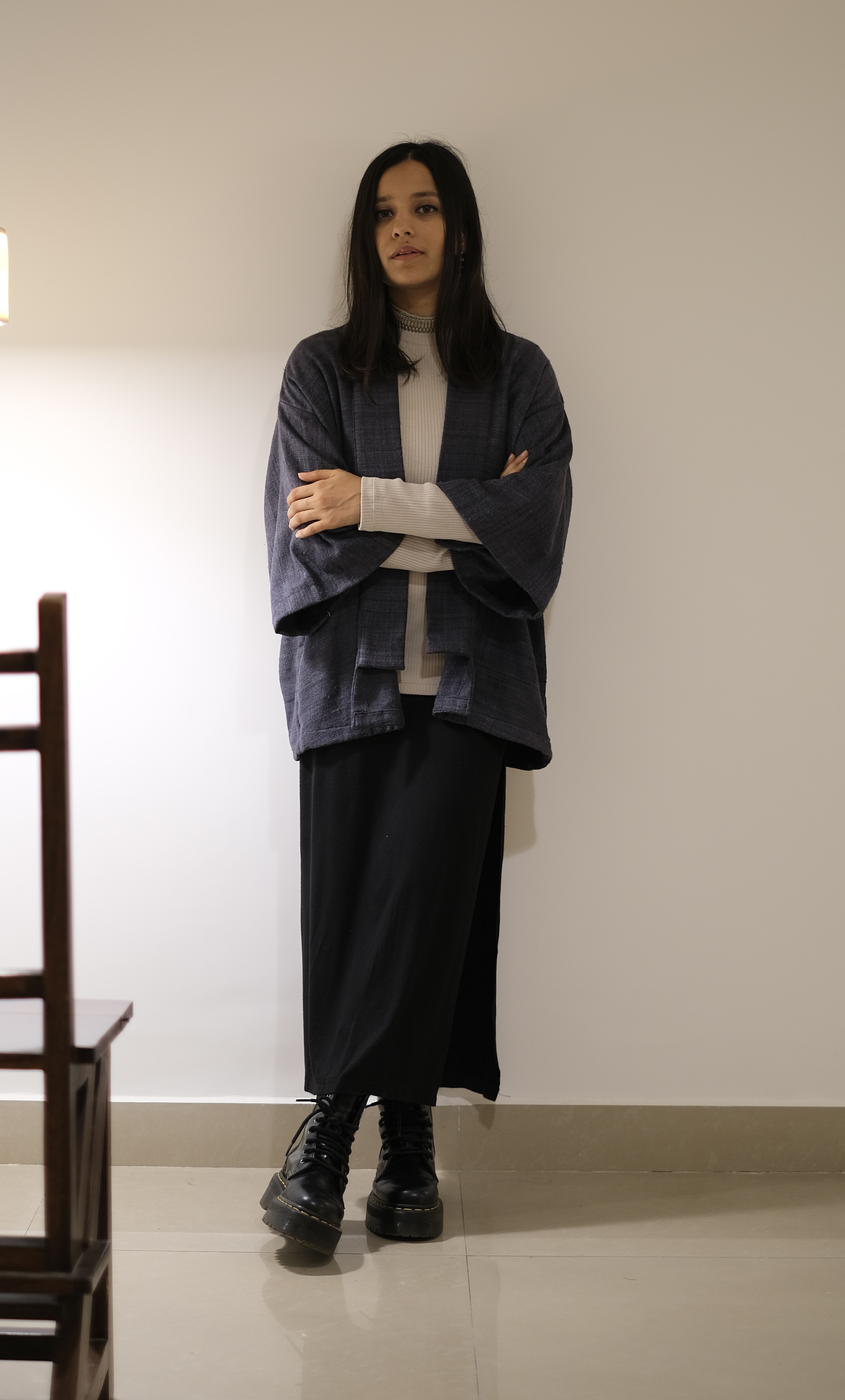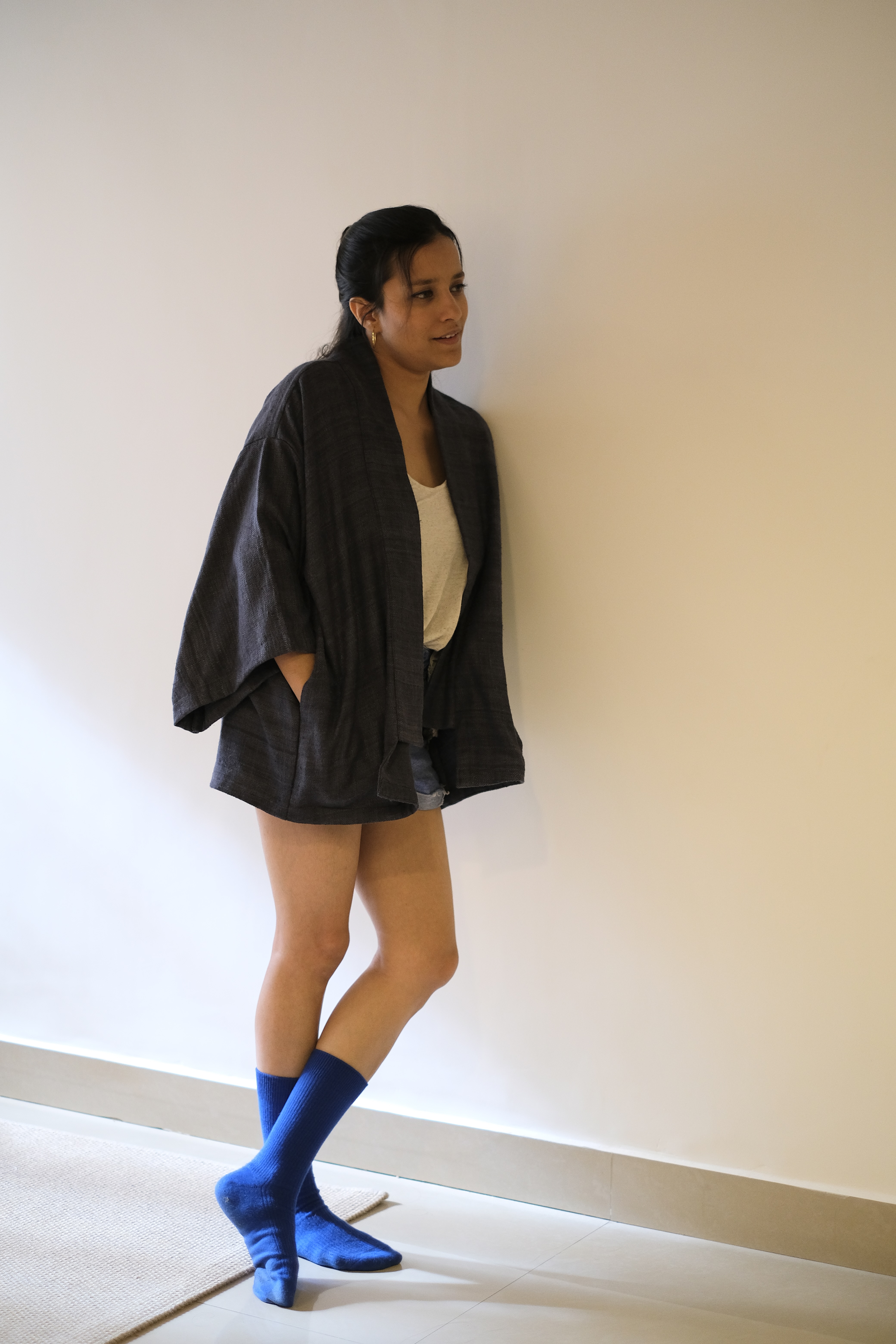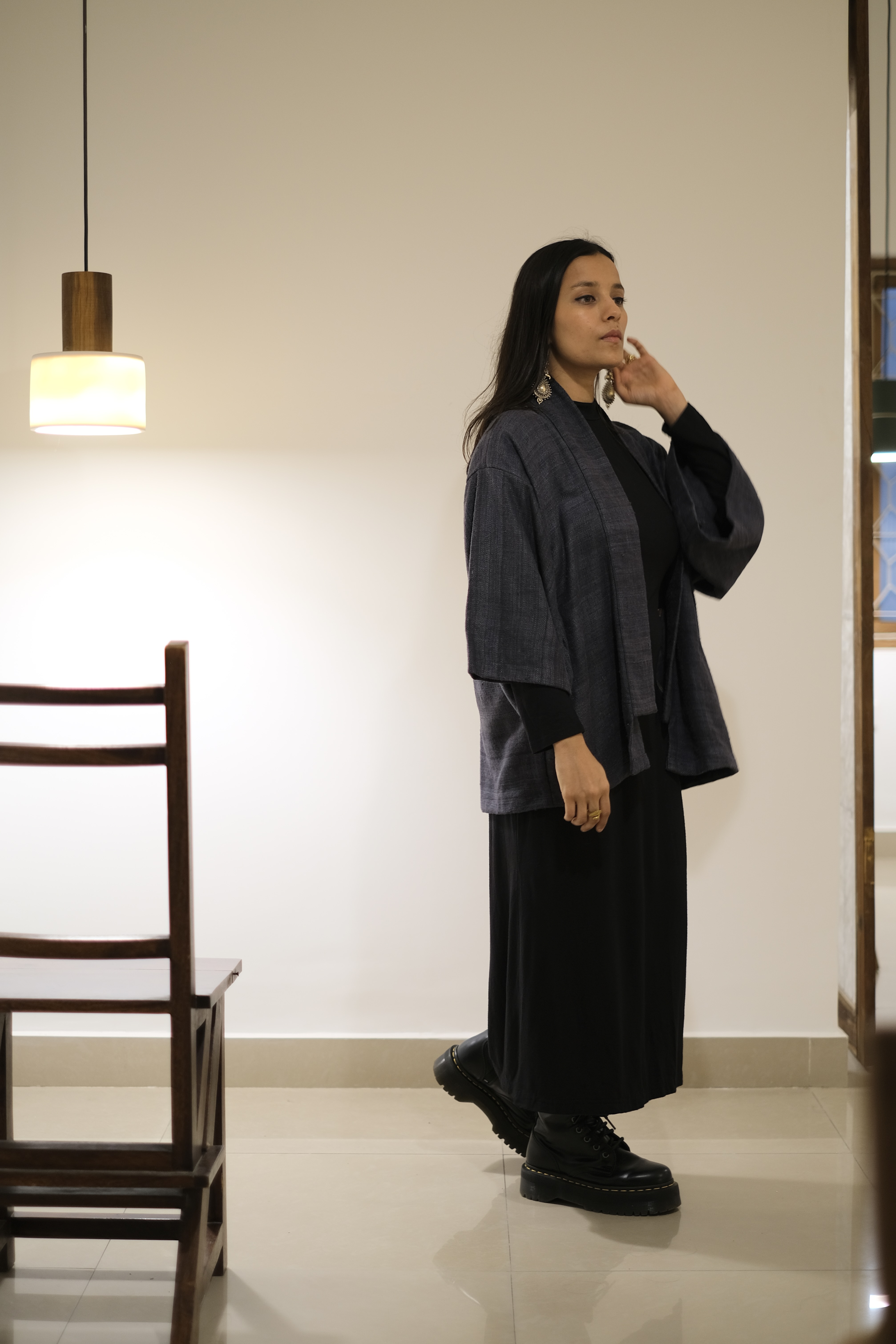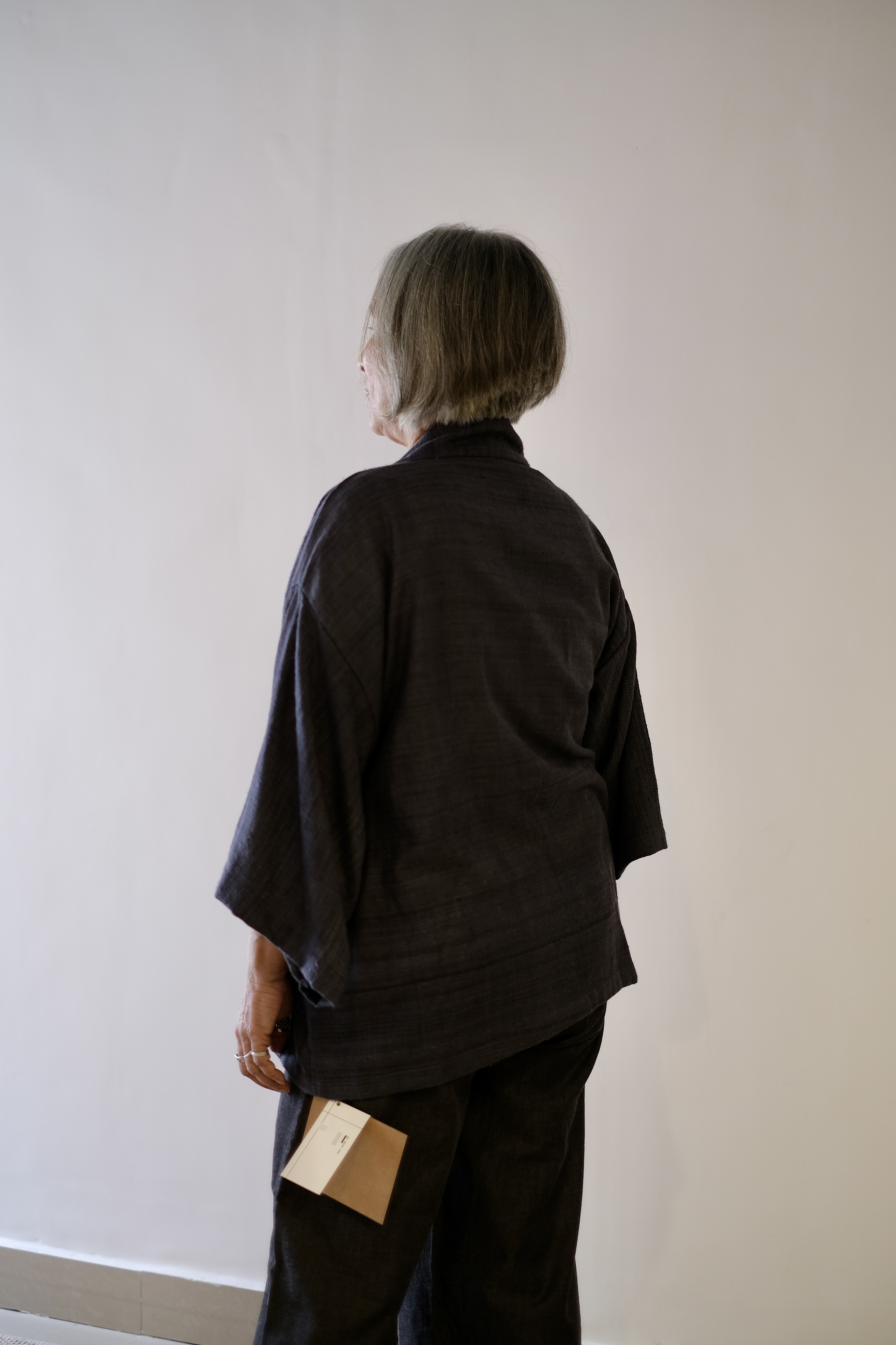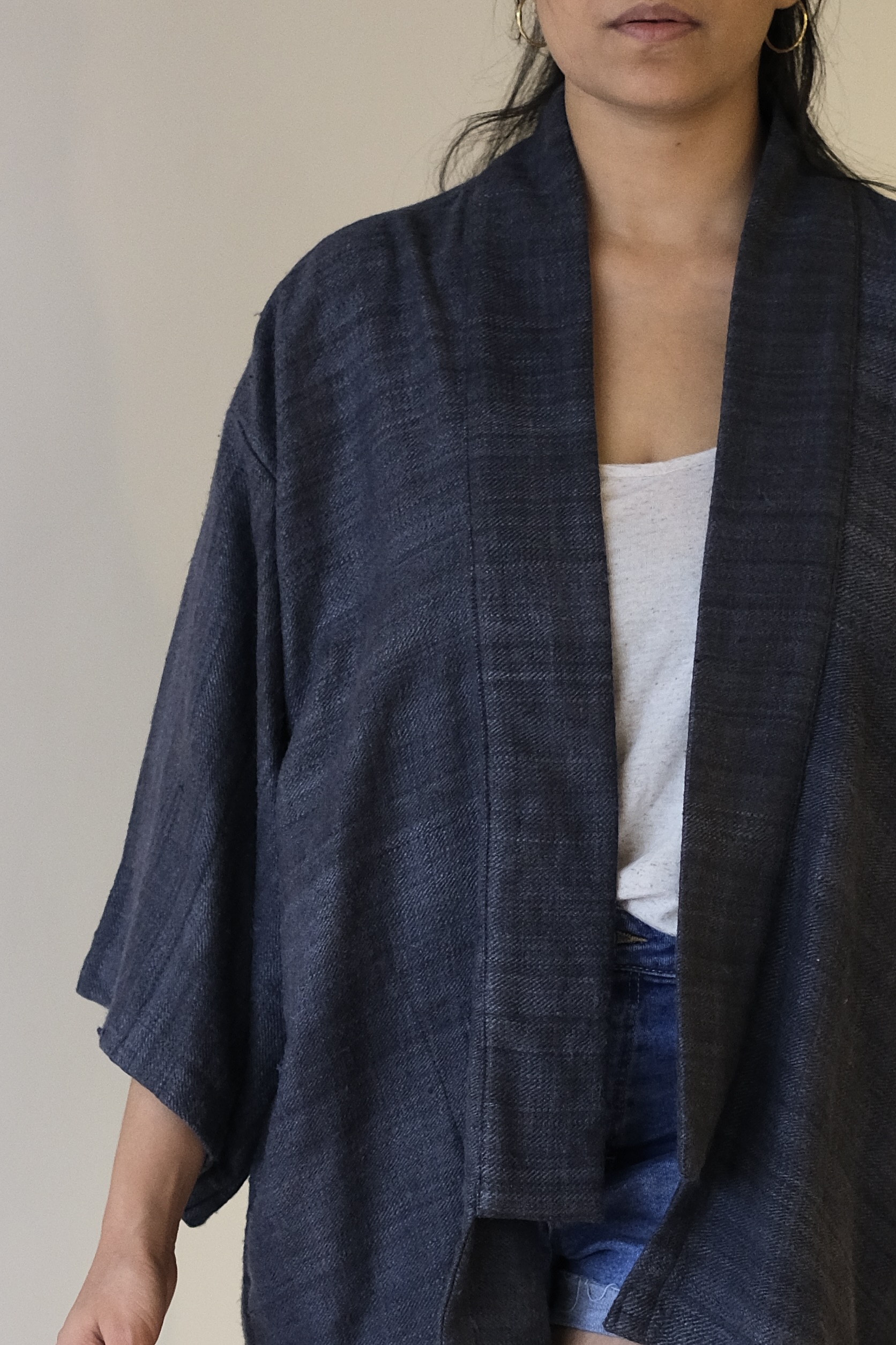 Relaxed haori-inspired sleeves, roomy pockets and the soft hug of eri silk in a freesize style. The perfect layer to throw on for the nip in the air (conditioner), no matter what the season. Handspun. Handwoven. Vegetable dyed. Tailored.
